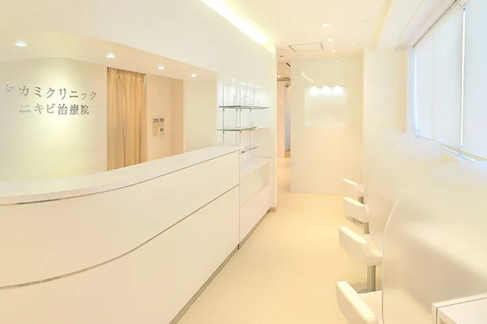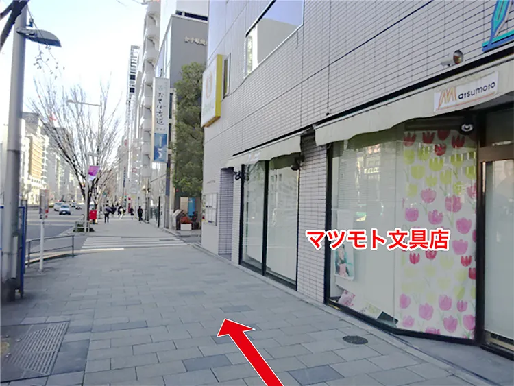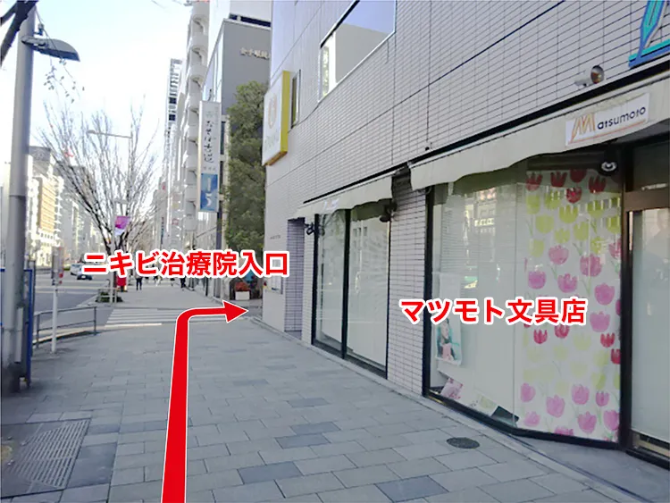 交差点から6軒目が、タカミクリニックのニキビ治療院のあるビルです。1階はマツモト文具店です。