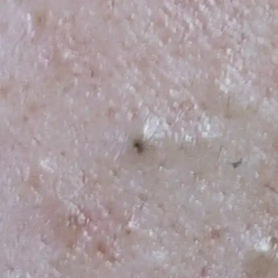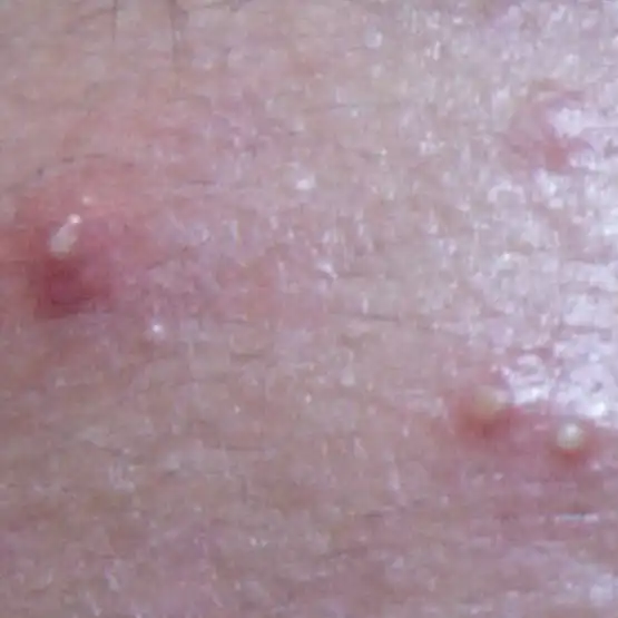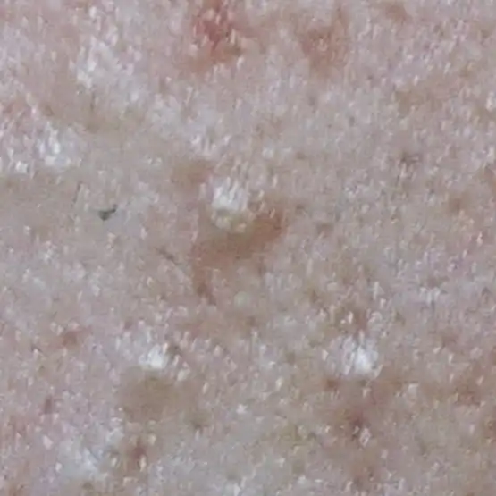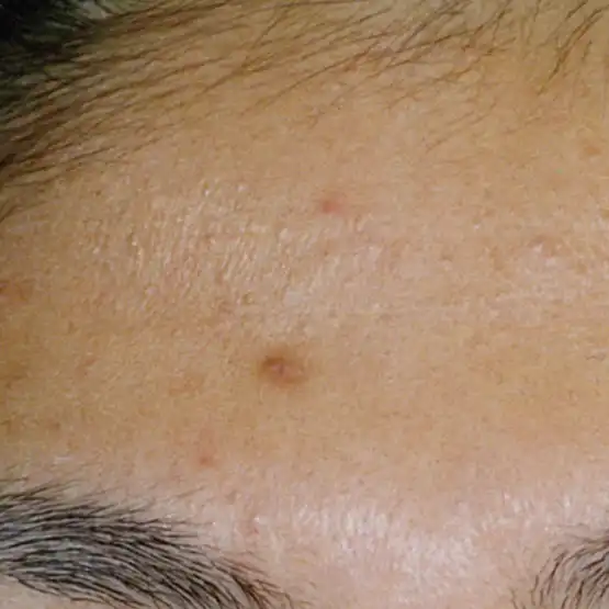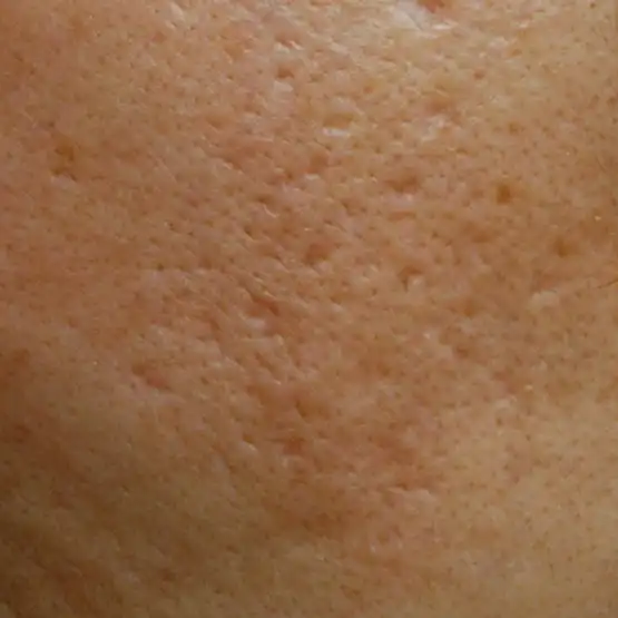 ニキビの初期段階で、コメドとも呼ばれる状態です。⽑⽳の中に⽪脂がたまりブツブツと盛り上がっています。炎症はまだ起こっていません。