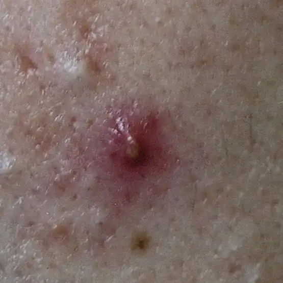⾚ニキビが進⾏し、膿を伴った状態です。ニキビ全体は⾚く、中⼼に⽩または⻩⾊の膿が透けて⾒えています。