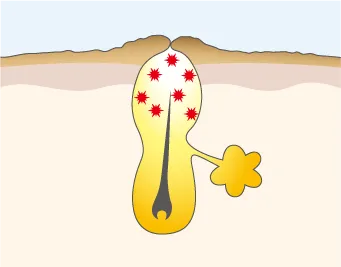 化膿が皮膚の深部にまで達し、皮膚の再生異常でしこりになることがあります。ニキビによる炎症が治まった後、線維芽細胞が壊れた真皮を修復しようとして細胞を作り過ぎてしまうことが原因でしこりになります。痛みを感じることはありません。