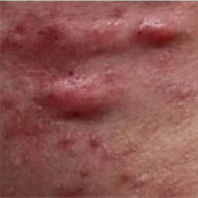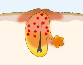 毛穴に溜まった皮脂を栄養分としてアクネ菌が繁殖して炎症が起きる。赤く腫れている状態。触れると痛い場合も。