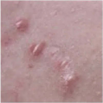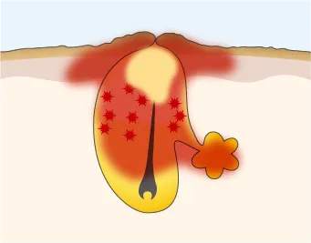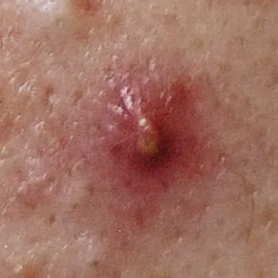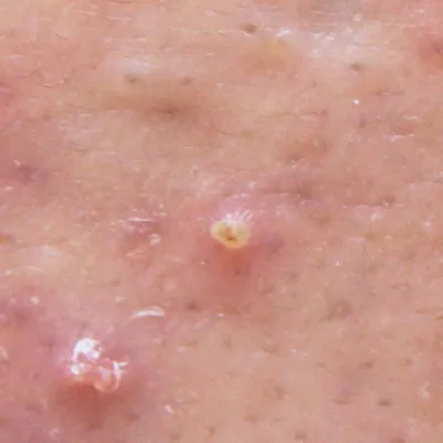 赤ニキビが進み、膿んでいる状態。ニキビ全体が赤く、毛穴内に膿が溜まり、表面が黄色く見える。