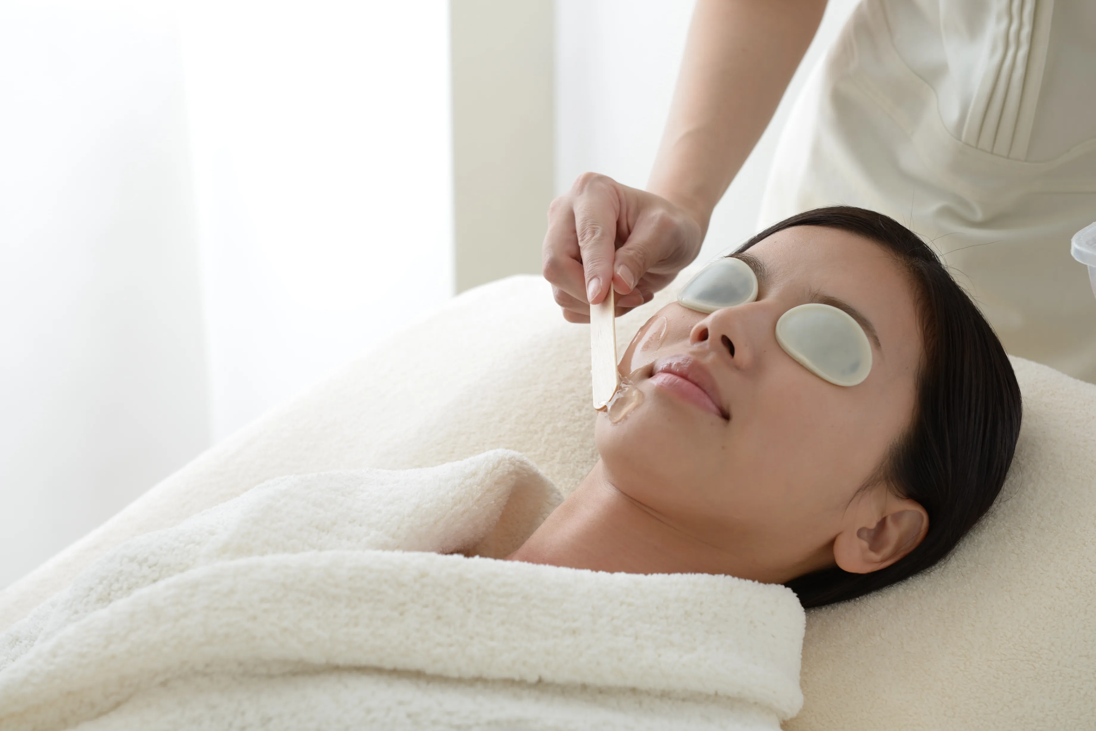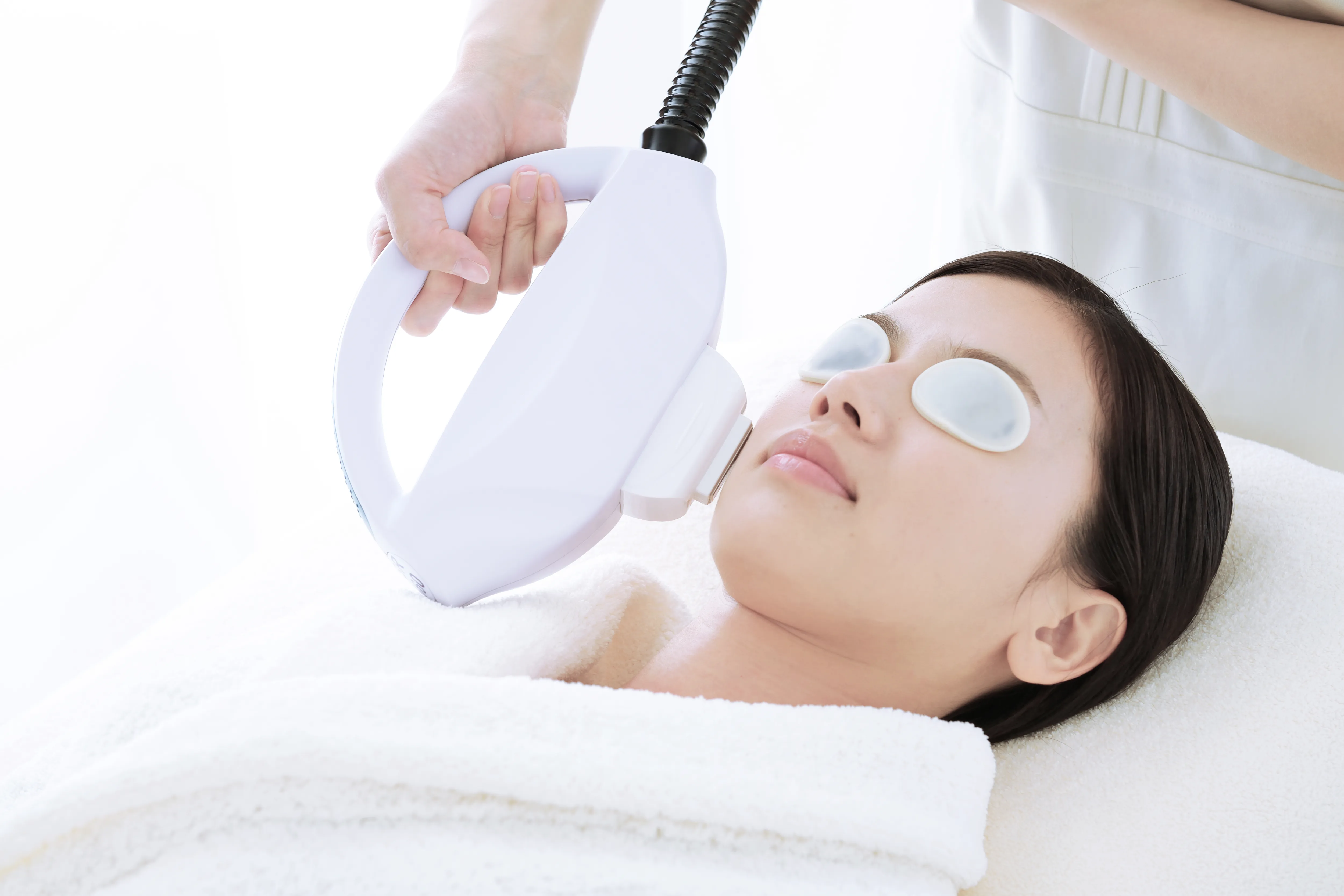 フォトフェイシャルのフラッシュの光から目を保護するためにアイプロテクトを着用し、お肌保護のために冷却効果のあるジェルを塗布します。